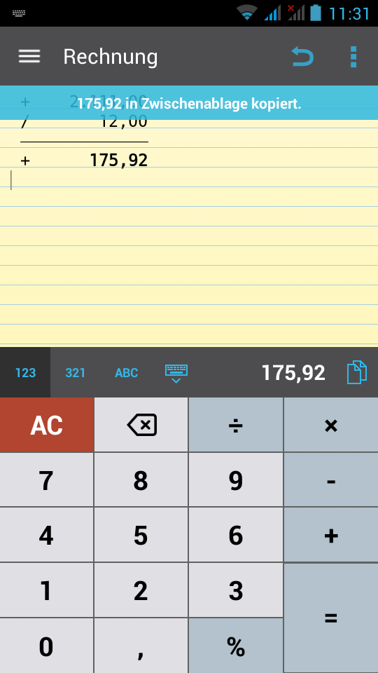 Durch Klicken auf das „Gleichzeichen” im Ziffernblock werden während der Rechnungen Zwischenergebnisse erstellt. Diese werden direkt rechts über dem Ziffernblock angezeigt. Zusätzlich wird neben den Zwischenergebnissen ein Kopier-Icon dargestellt, um schnell die errechneten Werte in andere Dokumente einzufügen oder damit woanders weiterzuarbeiten.