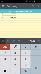Dafür können Sie zum Einem die Rechnung kopieren, indem Sie oberen rechts die Menü-Taste betätigen und auf „Kopieren“ klicken. CalcTape speichert nun ihre Rechnung in der Zwischenablage und Sie können die Rechnung ganz einfach in ein neues Dokument oder in ein bereits existierendes Dokument einfügen.