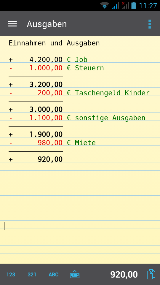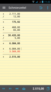 Des Weiteren kann CalcTape auch als Text-Editor agieren. Hierfür wechseln Sie direkt über der Tastatur vom Rechner-Modus zum Text-Editor-Modus. Nun sind die Rechnungen wie in einem normalen Text-Editor zu bearbeiten. Dazu zählt das Entfernen oder Hinzufügen einer Zeile, Aufsplitten oder Zusammenführen von Rechnungen und einfache Copy & Paste-Aktionen.