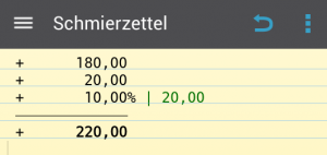 Neben den vier Grundrechenarten beherrscht CalcTape auch die Prozentrechnung. Somit lassen sich z.B. Steuerberechnungen auf einfache Weise vollziehen. Man fügt in der Rechnung den jeweiligen Prozentsatz ein, klickt dann auf das Prozentzeichen und anschließend auf das Gleichzeichen. Der Rechner berechnet zuerst die gesamte vorherige Rechnung, auf welches Ergebnis sich dann die Prozentrechnung bezieht. Der absolute Wert wird neben dem Prozentsatz als Kommentar dargestellt.