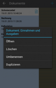 Um Dokumente umzubenennen, sie zu duplizieren oder auch um sie zu löschen drücken Sie bitte lange auf das entsprechende Dokument. Es öffnet sich ein Menü, in dem Sie zwischen den Funktionen „Öffnen“, „Umbenennen“, „Duplizieren“ und „Löschen“ wählen können.