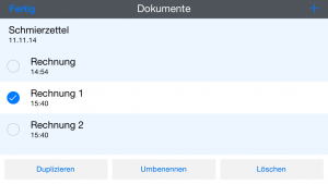 Beim Erstellen von Dokumenten, werden diesen automatisch Namen zugewiesen. Diese lassen sich ändern, indem Sie in der Dokumentenliste oben auf „bearbeiten“ klicken, das jeweilige Dokument auswählen und durch einen Klick auf „Umbenennen“ den Namen des Dokuments ändern. Außerdem ist es möglich mit demselben Prozess Dokumente zu duplizieren und auch wieder zu löschen.