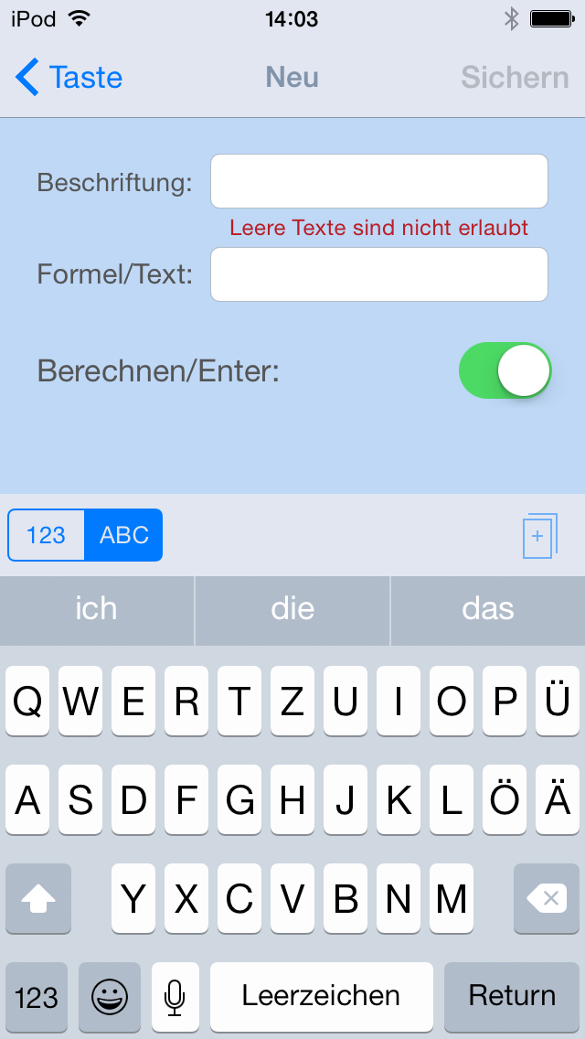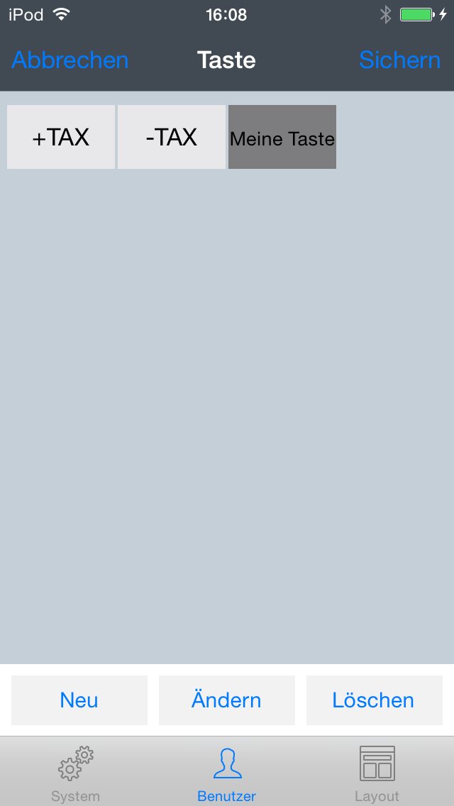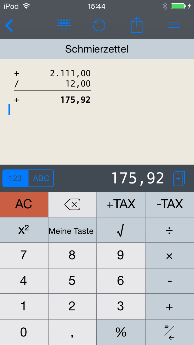 CalcTape für iOS bietet die Möglichkeit, Tasten mit benutzerdefinierten Formeln oder Texten zu erstellen. Dies ermöglicht Ihnen Tasten herzustellen, die bei CalcTape nicht von vornherein im Ziffernblock integriert sind, aber für Ihren alltäglichen Gebrauch wichtig und Ihnen bei der Anwendung von CalcTape behilflich sein können. Dazu halten Sie entweder die „Meine-Taste“-Taste oder einen der Operatoren auf der Tastatur gedrückt, bis ein neues Fenster erscheint. Dort können Sie nun neue Benutzer-Tasten hinzufügen oder bereits vorhandene Benutzer-Tasten ändern. ~~UP~~