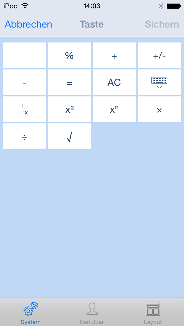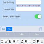 Um eine neue Benutzer-Taste zu erstellen, halten Sie entweder die „Meine-Taste“-Taste oder einen der Operatoren auf der Tastatur gedrückt, bis ein neues Fenster erscheint. Klicken Sie auf „Neu“ und es öffnet sich ein neues Fenster. Geben Sie nun Beschriftung, Formel und/oder Text ein und sichern Sie ihre Eingaben. In der unteren Tab-Bar können Sie außerdem weitere System-Tasten hinzufügen oder unter Layout die Größe der Tasten einstellen. Damit können Sie auch die Anordnung der Tasten auf der Tastatur verändern.