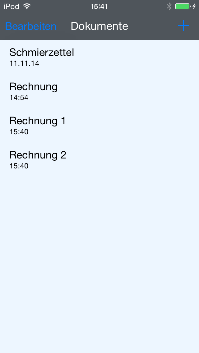 Standardmäßig ist das erste geöffnete Dokument der Schmierzettel. Falls Sie ein neues Dokument erstellen möchten, wechseln Sie dafür in die Dokumentenliste, entweder über den Pfeil in der linken oberen Ecke oder durch eine Wischgeste von der linken Displayseite in die Mitte. In der Dokumentenliste befinden sich alle gespeicherten Dokumente. Um ein neues Dokument zu erstellen, klicken Sie nun auf das Pluszeichen in der rechten oberen Ecke.