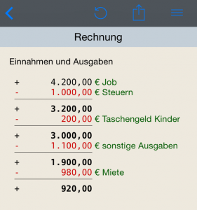 CalcTape bietet an, Berechnungen zu teilen und zu drucken. Dies geht wie folgt: Durch einen Klick auf die Teilentaste in der Navigationsleiste, erscheint ein Menü, worüber Sie die Rechnung beispielsweise über E-Mail verschicken oder mit Apps teilen können. Darüber hinaus gibt es die Möglichkeit Berechnungen zu drucken. ~~UP~~