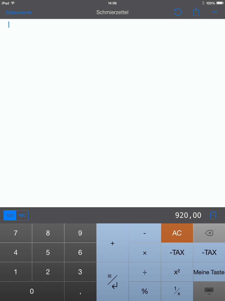 Die CalcTape-Benutzeroberfläche ist übersichtlich gestaltet. Etwa die Hälfte des Bildschirms wird von der Tastatur eingenommen. Darüber befindet sich der Editor, worin Sie ihre Rechnungen tätigen können. Die Navigationsleiste ist im oberen Bereich integriert. Über diese gelangen Sie in die Einstellungen, wo Sie das aktuelle Dokument drucken oder teilen, die Tastatur herunterfahren (beim iPad können Sie dies rechts unten an der Tastatur vornehmen), Eingaben rückgängig machen oder wiederherstellen können. Mit dem Pfeil in der linken oberen Ecke wechseln Sie in die Dokumentenliste.