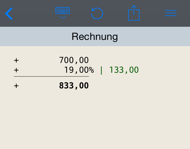 CalcTape bietet die Möglichkeit an, Rechnungen im Nachhinein zu korrigieren und zu verändern. Hierfür begeben Sie sich in die zu verändernde Zeile und löschen den Teil raus, welchen Sie nicht mehr benötigen oder geben dort einen neuen Wert ein. Die gesamte Rechnung wird dann automatisch aktualisiert. ~~UP~~