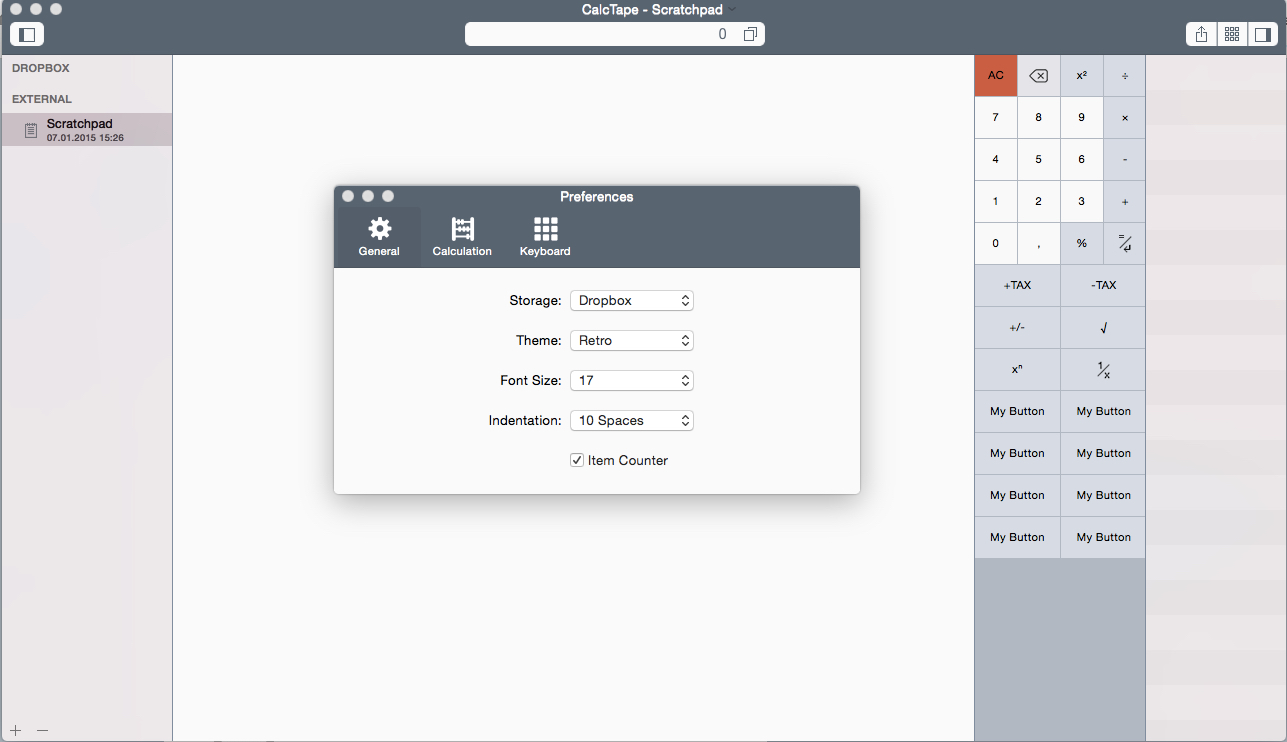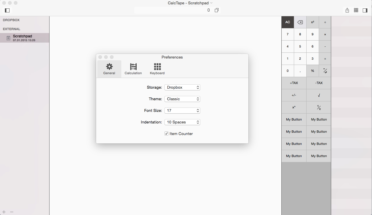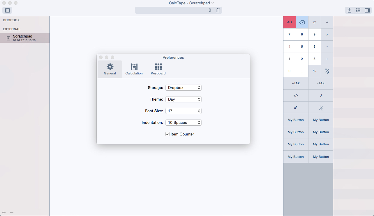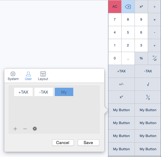 CalcTape for OS X gives the possibility to create buttons with custom formulas and texts. These allows you to create buttons which are not directly integrated in CalcTape. With a right click on all buttons except the numbers on the num pad, you can open a window where you can create new custom buttons, change already existing buttons or the layout.