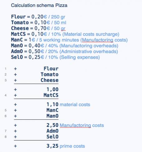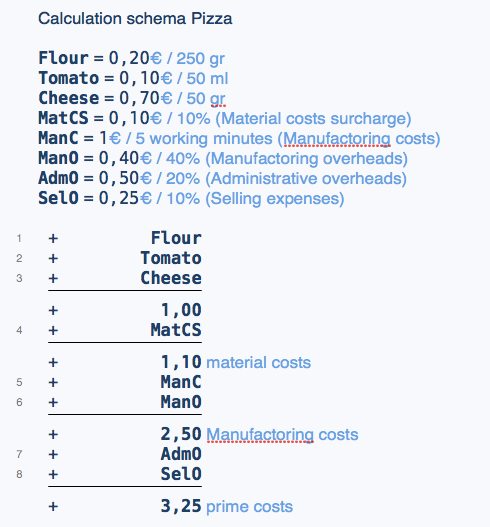 The example shows the prime cost calculation of a pizza. If you change one of the variables, the complete calculations will be updated and a new prime cost will be calculated.