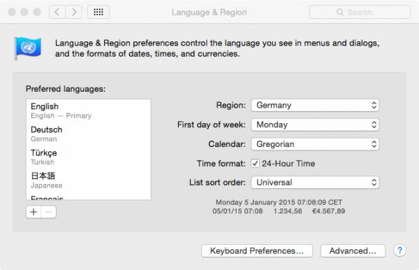 To change the display language, go to system preferences and click on “Language & Region”. The order in preferred languages is very important because it defines how CalcTape selects the display language. Move the language you want to use to first position and close the “Language & Region” window. Now you are asked to restart your Mac. After the restart, the selected language is active. If you are not from Germany make sure that English is over German in preferred languages.