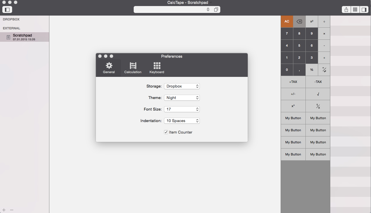 The settings can be reached over the top menu by clicking on CalcTape → Settings or with the shortcut “cmd + ,”. In settings you can change for instance font size or the theme, but also the rounding behavior or the keyboard layout.