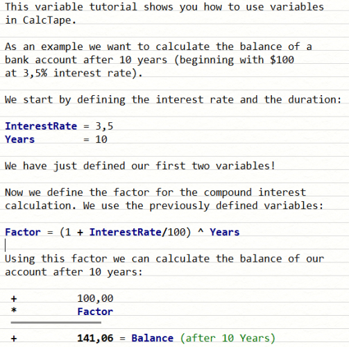 Variables can be defined and used as follow: A variable is defined when you assign a value to a label. Example: interest rate = 3,5 After the assignation the label will be colored in a blue color which is the typical mark of an variable. It should be noted that there is some limitation in the naming of variables: No special characters can be used and variable names must begin with a letter. Also changing and deleting a variable is very simple. Going to the line where the variable is located and change the value or delete the line.